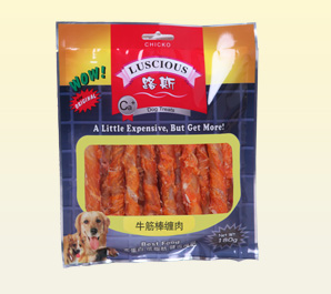 产品名称:牛筋棒缠肉 规格型号:180g 每箱数量:30袋 公司网址:www.luspet.com