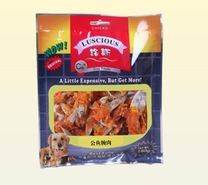 产品名称:鳕鱼圈缠肉 规格型号:180g 每箱数量:30袋 公司网址:www.luspet.com